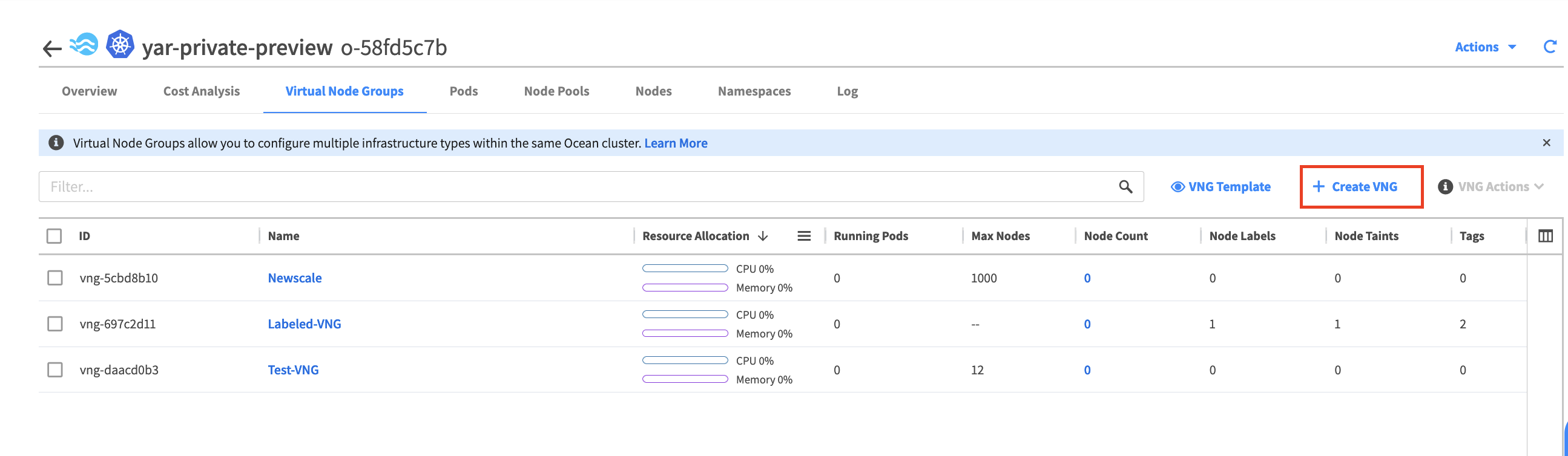 In the Ocean cluster view, enter the Virtual Node Groups tab